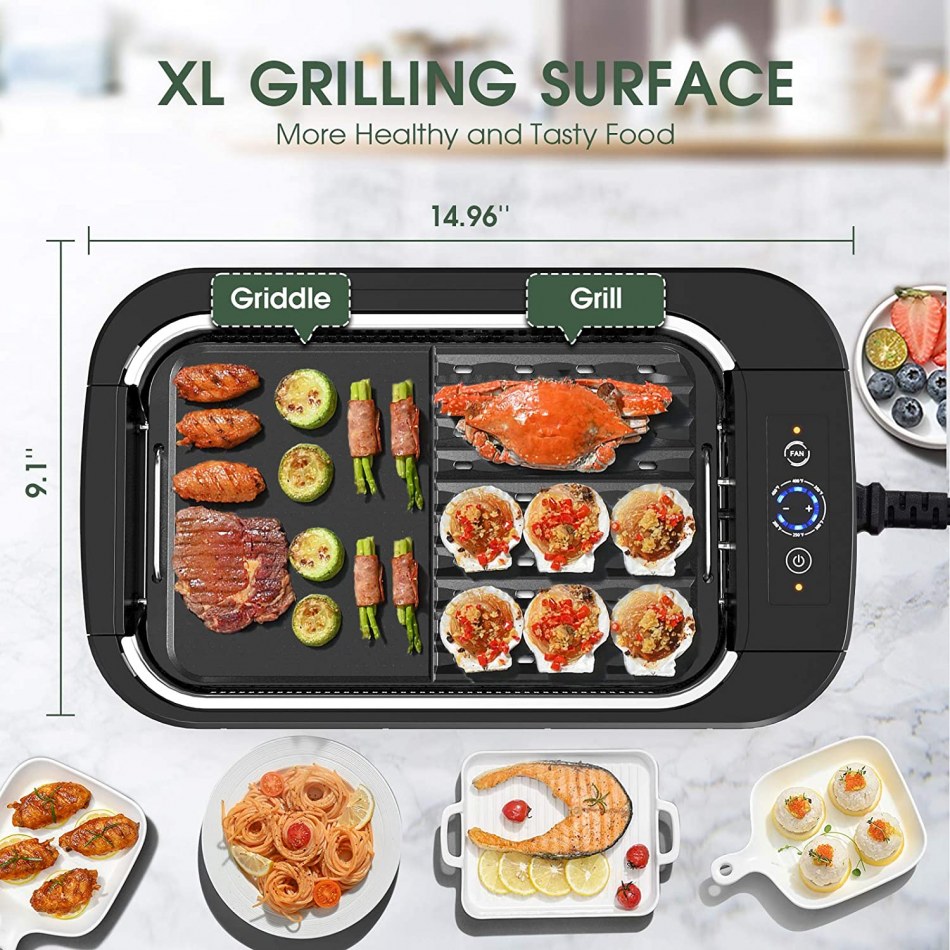 2-in-1 removable griddle plate, divided into 2 surfaces; portable smokeless grill with non-stick ceramic coating