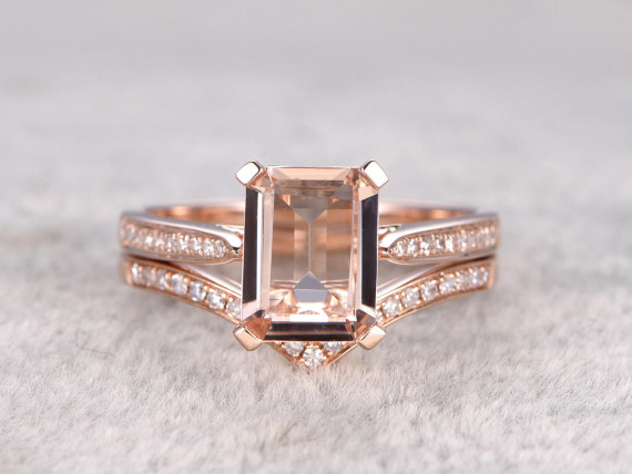 2pcs Bridal Ring Set,Solitaire Morganite Engagement ring Rose gold,Curve Diamond weddin...