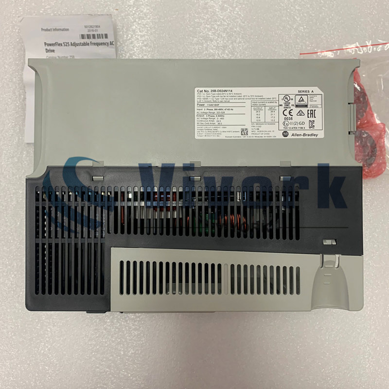 The 25b d024n114 is an Allen-Bradley PowerFlex 525 drive that comes as a 3-phase drive. The 25B-D024N114 features a voltage of 480 Volts AC with 24 Amps of output current and it features the IP20 NEMA open type enclosure. The 25B-D024N114 comes with a standard interface module and features the frame size of D with an EMC filtering option available. The 25B-D024N114 is an easy-to-install drive that features a modular design with an embedded EtherNet/IP port and it comes with an option for the dual-port EtherNet/IP adapter that has support for the DLR functionality. The 25B-D024N114 also features the LCD human-machine interface with multiple language support. The LCD screen supports programming through a MainFree USB and the 25B-D024N114 can be configured by using connected components. The 25B-D024N114 features support for the add-on profiles for the Studio5000™ Logix Designer program allowing automatic configuration of the device through the installed program.