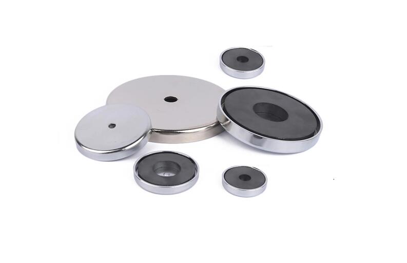 Flat ceramic pot magnets with threaded through hole that ferrite ring magnets housed in a flat cup shape steel shell with threaded socket in the center.