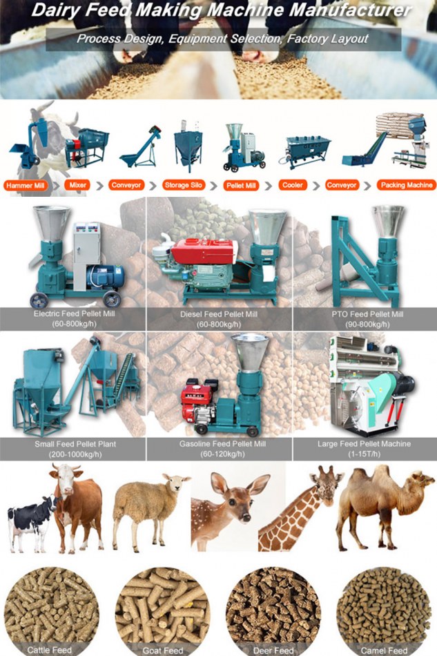 Generally, dairy feed making machine have two types: Flat die feed pellet mill, suitable for household, farm, small cattle feed plant, etc.; Can be driven by electricity, diesel, gasoline, and PTO. Ring die feed pellet mill, suitable for large scale feed plant or commercial feed mill plant.
