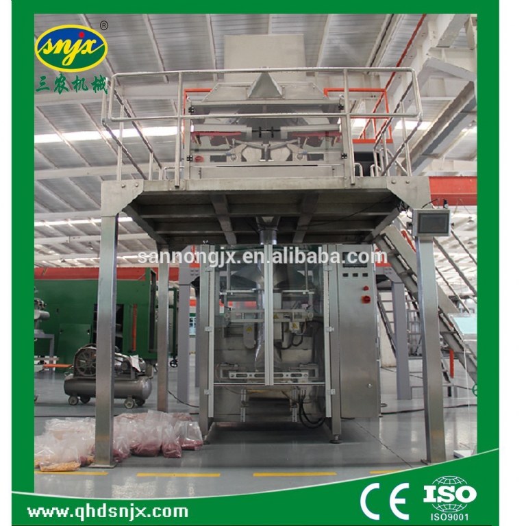 This automatic packing machine whole system include one SN7300 vertical bag making and fi lling machine, one SNF2000 Electronic weighing machine,and DT2 bucket conveyor .it set bag, filling, sealing, printing, counting on the whole, the bag clamping, ramming punching bag as optional, using servo motor control dragging the film. Have automatic adjust function, PLC are world famous brand. It features that working reliable and horizontal and vertical sealing by pneumatic with smooth and r eliable movements. easy operation and maintenance. It is widely used in various industry such as fer tilizer , wheat flour, food, and chemical industry etc.It satisfy the GMP and HACCP standard.