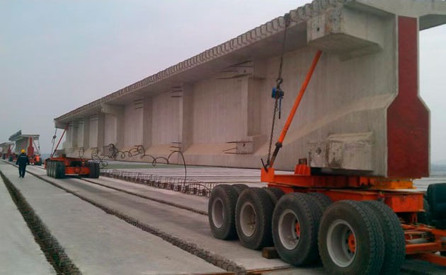 A common method of concrete girder loading is using a gantry crane to lift the girder onto the vehicle, and place wood and rubber blocks on the I- beam steering wheel of the vehicle. Girder barycenter shall be right on the central line of the steering wheel or the vehicle. When the barycenter of the girder deviates from the center, it shall enable barycenter of concrete girder overlap the center.