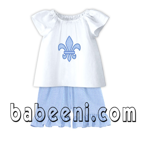 Traditional styling peasant clothing with short sleeve and pant, the pattern Fleur de Lis appliqué on the body. Size 3months to 10 years, The elastic neckline makes for an easy on and off, fabric 100% cotton