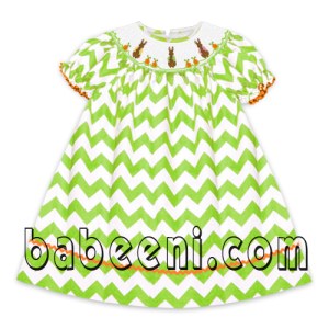 Green chevron smocked dress for easter, it features smocked patterns brown rabbit and rabbit in the field , zig zag at the short sleeve matching with hemline at the dress, buttons at the back for on and off