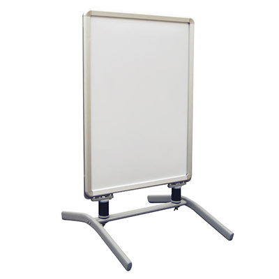 This banner stand material is aluminum, so they are light weight and resistant to rusting. These A-frame sign stands snap open and closed on each side to securely contain the graphic and plastic lens inside, that protect the signage panels and decrease glare.