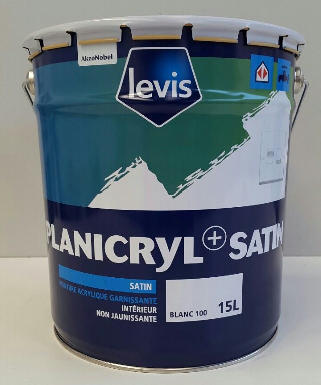 Palette de peinture professionnelle Astral et Levis, conditionnement en pot de 15L, blanc mate ou satin. Enviro à partir de 2€ du litre.