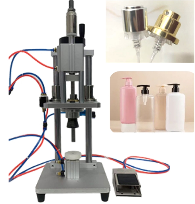 Pneumatic crimping and capping machine, ideal for perfume glass bottles, spray bottles, plastic bottles, PET bottles, plastic pump caps, spray nozzles and more. Supports multiple bottle sizes with strong compatibility.