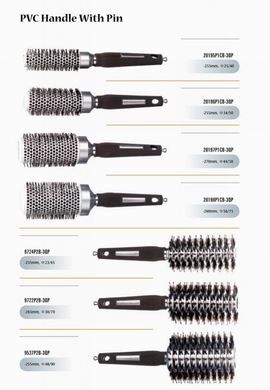 (1)PVC soft handle with a pin, and head of the brushes can be aluminium brushes or with ceramic finished, or paddle brushes, and can be ruberised or spray paingint finished.