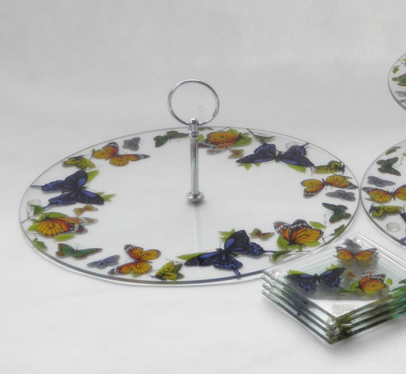 Single-deck glass food holder with colorful pattern